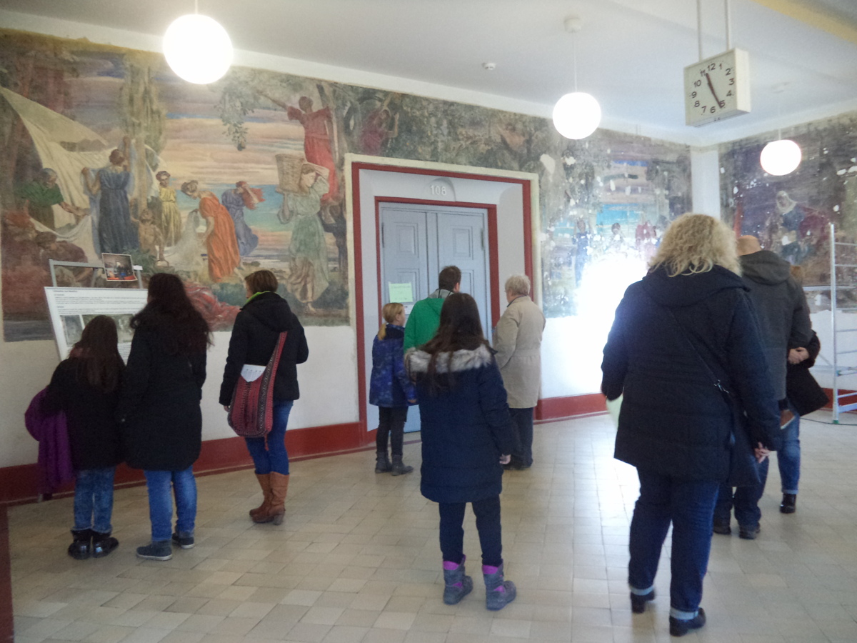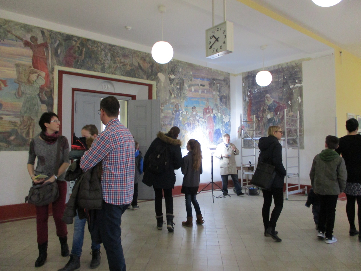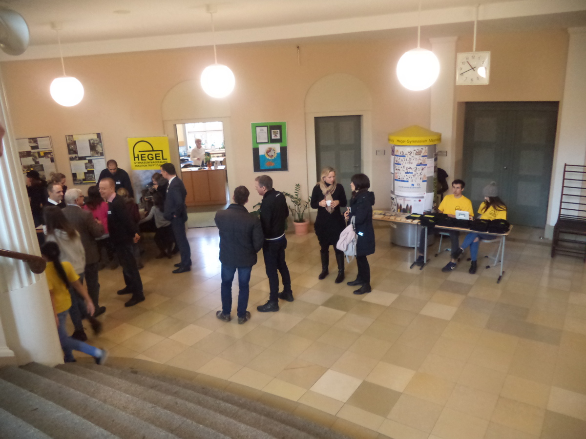 Schülerrat, Förderverein und die Juniorbotschafter berichteten über ihre Aktivitäten und kamen so mit Interessierten ins Gespräch.. Über den Fortgang der Restaurierung am Wandbild konnte man sich vor Ort mit Herr Bunzental austauschen.