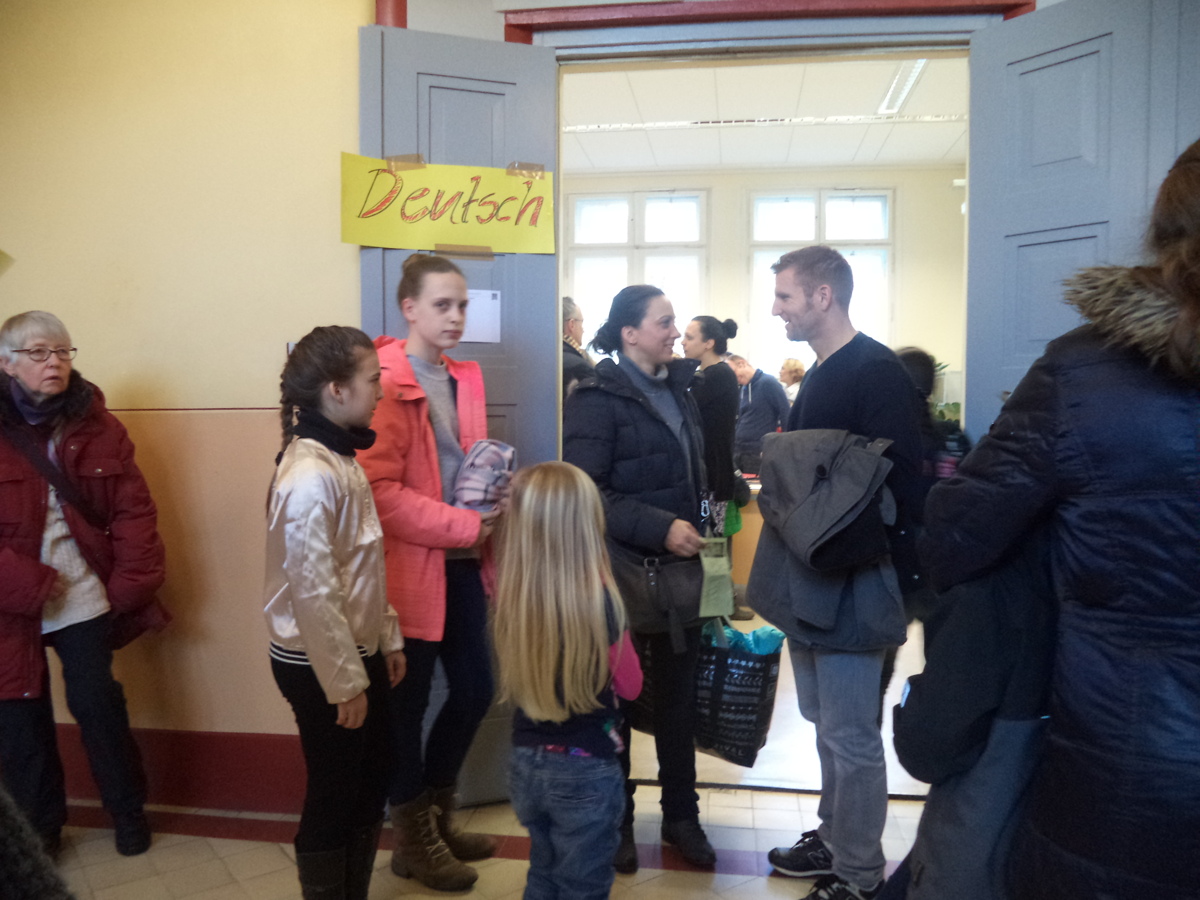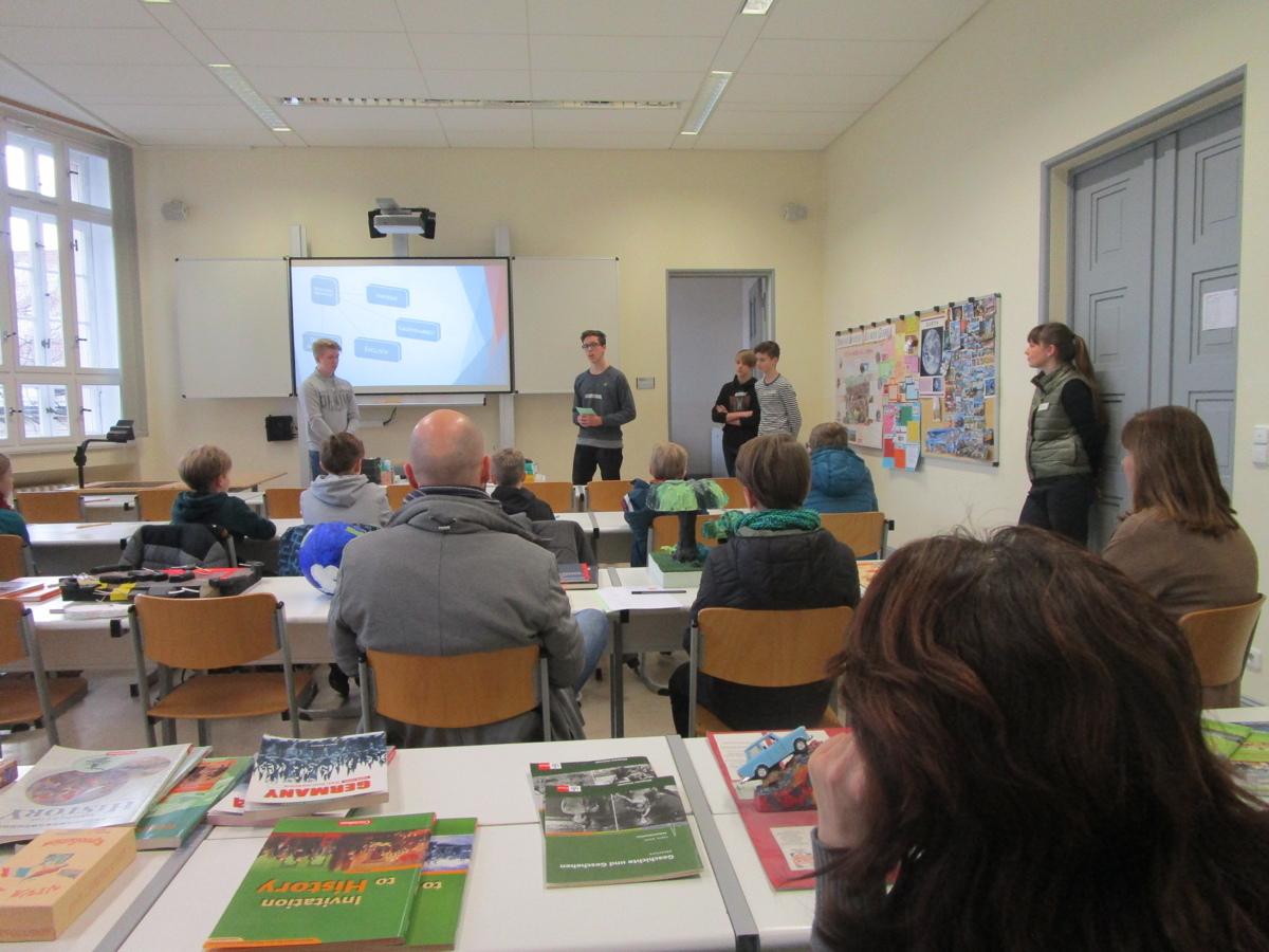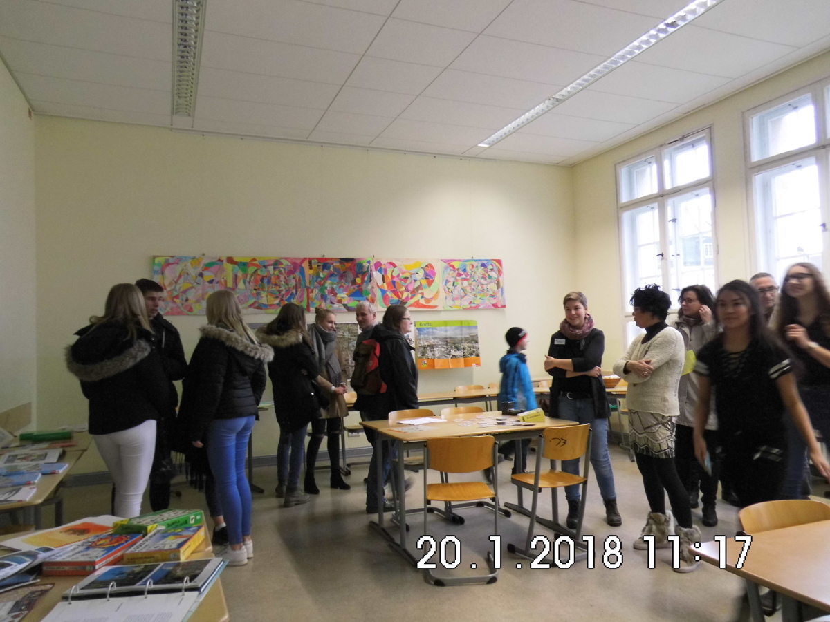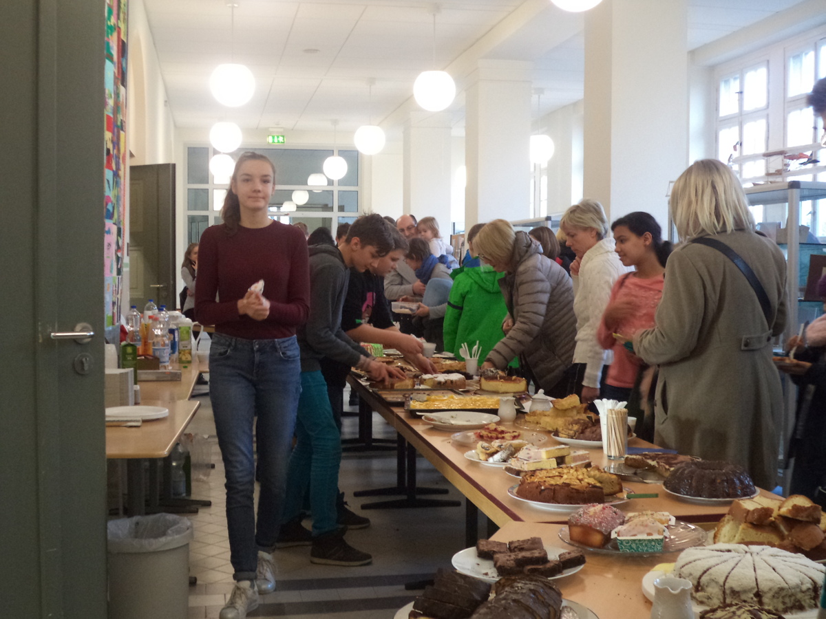 Schülerrat, Förderverein und die Juniorbotschafter berichteten über ihre Aktivitäten und kamen so mit Interessierten ins Gespräch.. Über den Fortgang der Restaurierung am Wandbild konnte man sich vor Ort mit Herr Bunzental austauschen.
