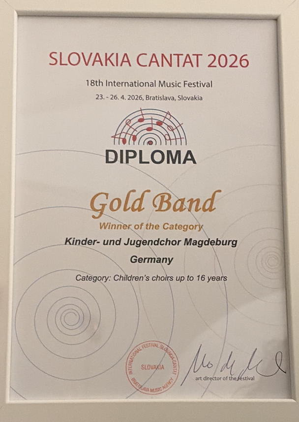 In der slowakischen Hauptstadt präsentierte der Konzertchor ein ausgewähltes Programm vor der internationalen Jury und erreichte mit 93 von 100 Punkten die Auszeichnung „Goldenes Band“, sowie einen Sonderpreis. Damit zählt der Kinder- und Jugendchor Magdeburg zu den drei besten Chören des Festivals. Die Goldkehlchen haben einmal mehr ihre herausragende Qualität bewiesen.