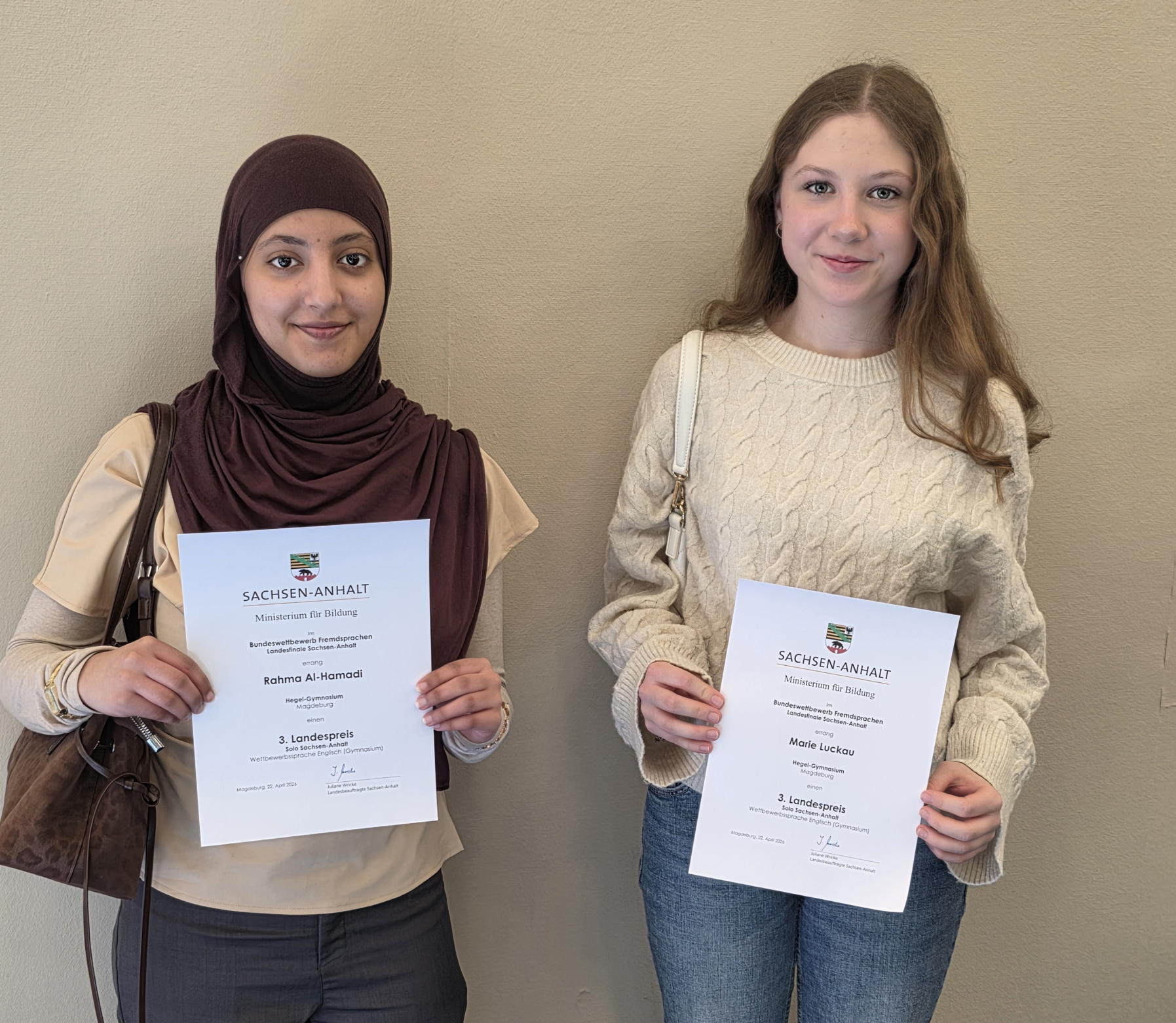 Am Wettbewerb SOLO im Fach Englisch nahmen in Sachsen-Anhalt insgesamt 77 Schülerinnen und Schüler der Klassenstufen 8-10 teil. Und zu den Besten gehörten Rahma Al-Hamadi und Marie Luckau aus der Klasse 9/2, die beide mit einem 3. Landespreis ausgezeichnet und zum Landesseminar nach Dessau eingeladen wurden.
